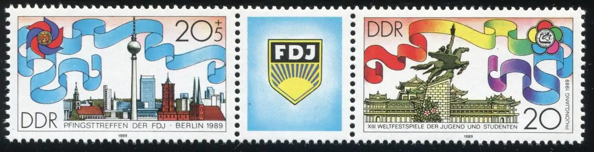 Zusammendruck mit Plattenfehler auf der rechten Marke 3249: Fleck unten hinter erstem D von DDR und zusätzlich kleiner schwarzer Strich unten am Tempel