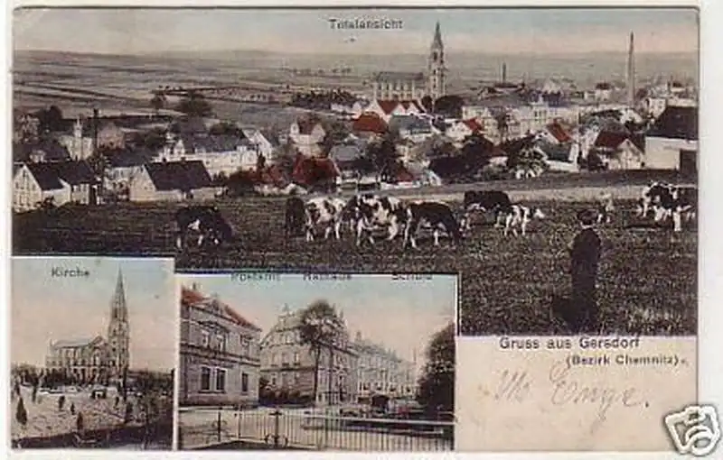 Totalansicht mit Kuhherde im Vordergrund, Kirche, Postamt, Rathaus, Schule,  gelaufen, gute Erhaltung (gering fleckig) siehe Bild,