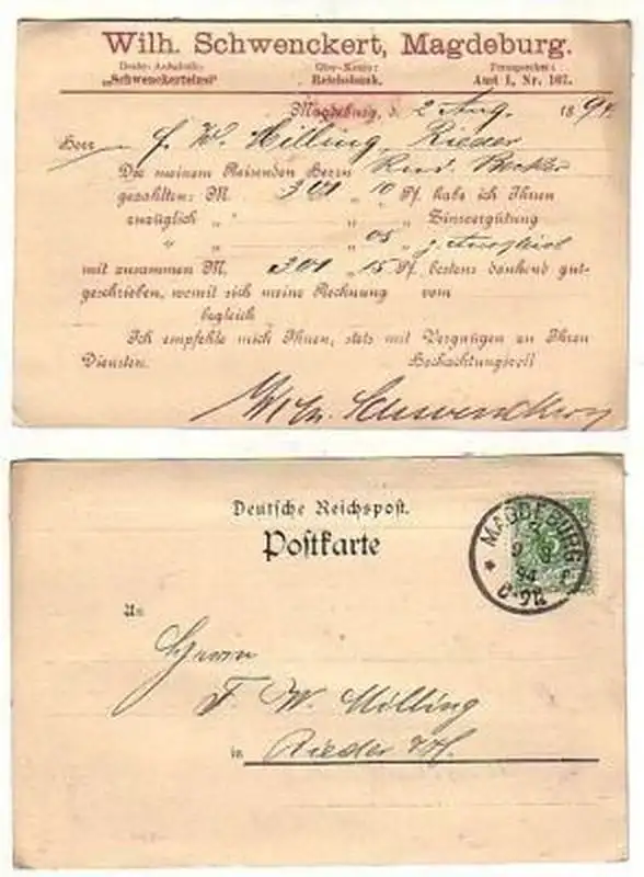 Reklame / Werbekarte, Wilh. Schwenkert Magdeburg Draht Aufschrift: "Schwenckersteins", gelaufen, gute Erhaltung (geringe Altersspuren) siehe Bild,