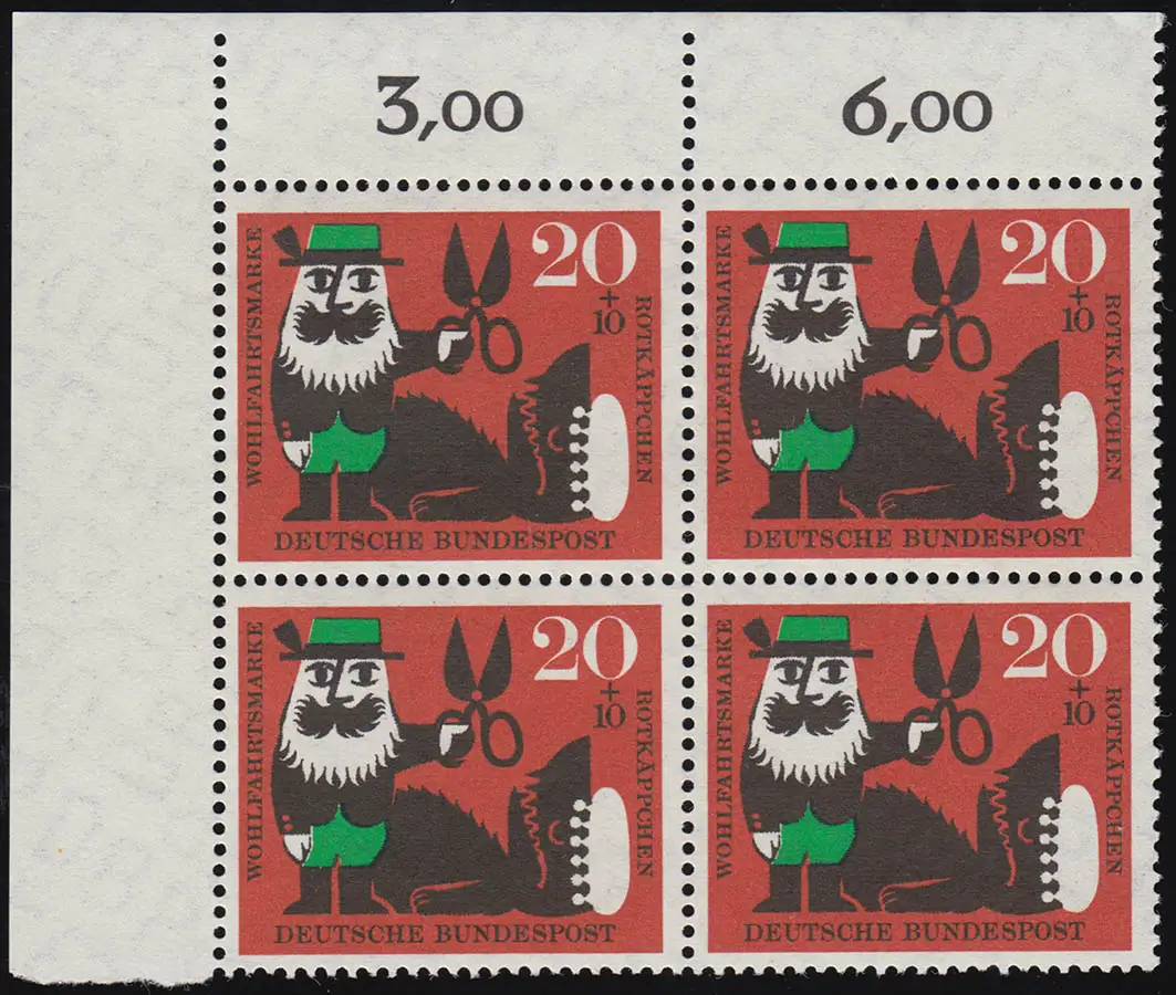 342 Wohlfahrt Grimm 20+10 Pf Rotkäppchen ** Eck-Vbl o.l. Zähnung 0-7