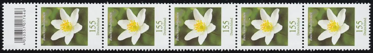 3472 Buschwindröschen 155 Cent 500er große Nr., 5er-Streifen mit Codierfeld **