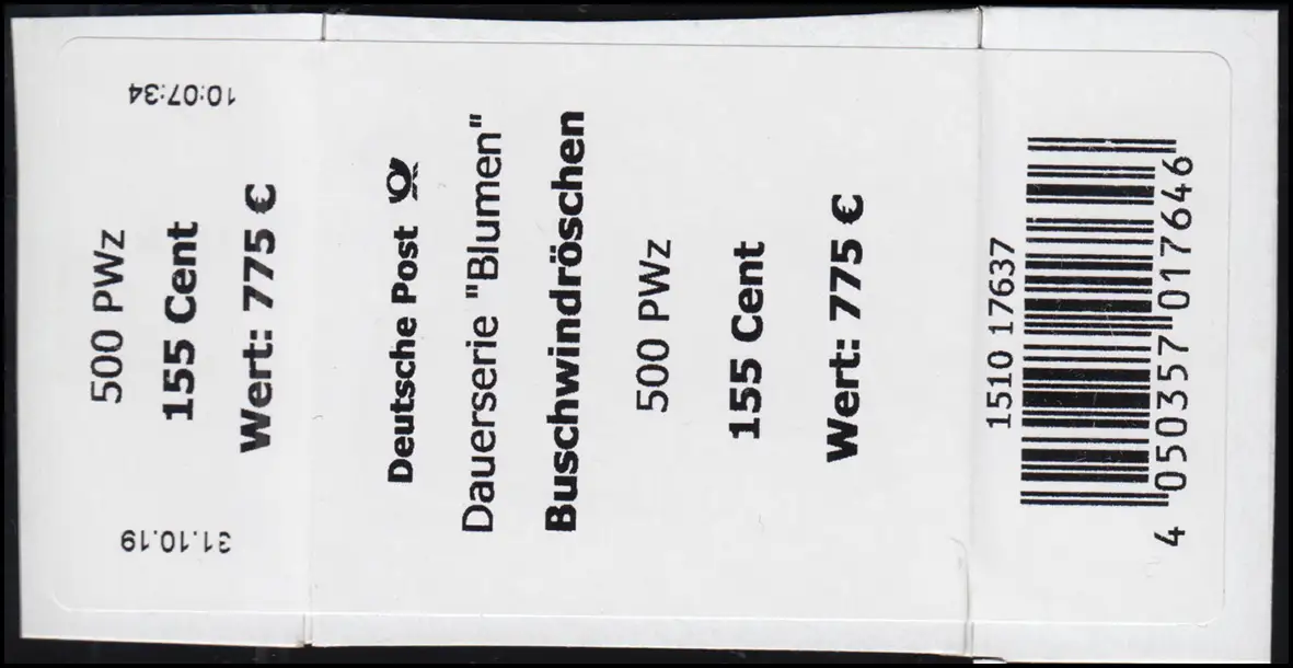 3472 Buschwindröschen 155 Cent + CF Banderole/Aufkleber für 500er kleine Nummer