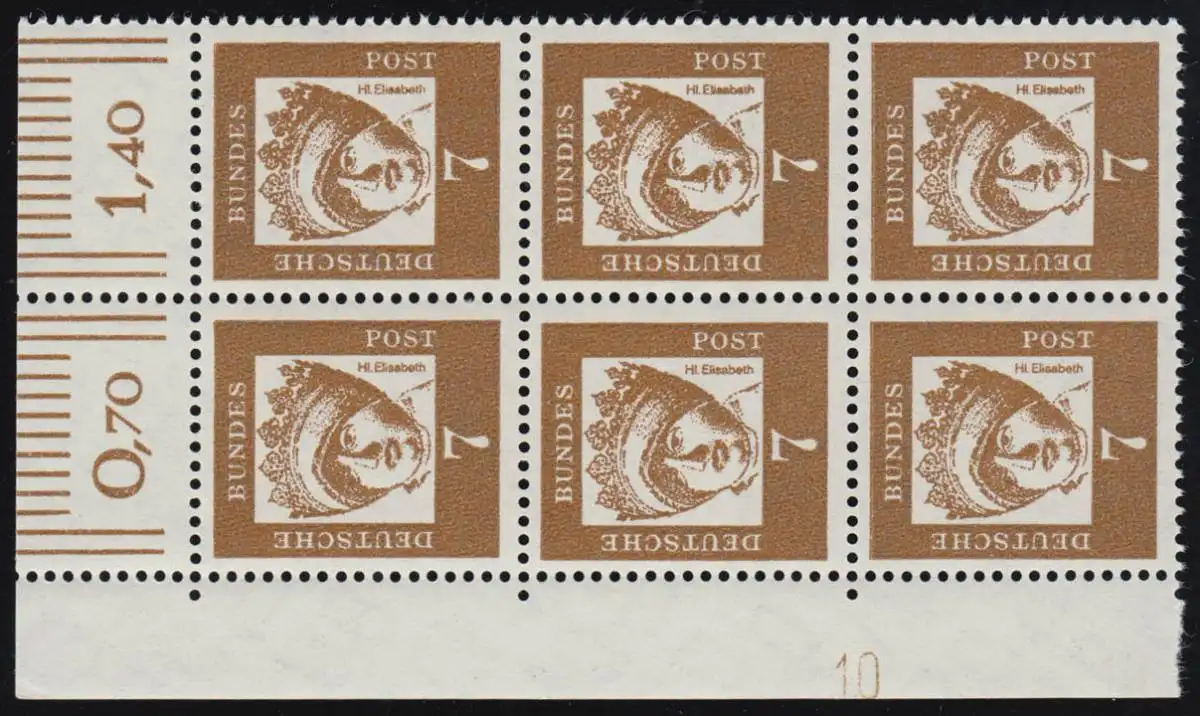 348y DZ Hl. Elisabeth 7 Pf als Eck-6er o.l. mit Druckerzeichen 10, **
