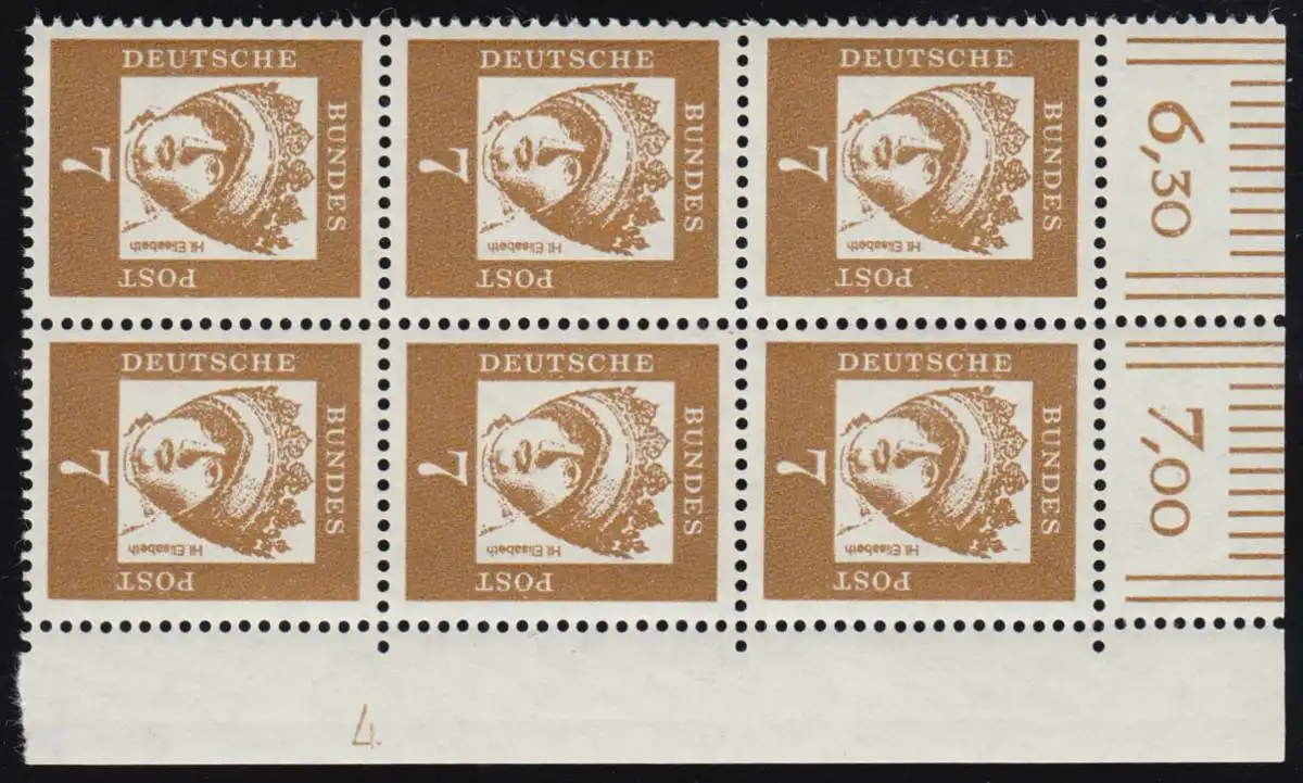 348y DZ Hl. Elisabeth 7 Pf als Eck-6er o.r. mit Druckerzeichen 4 unten, **
