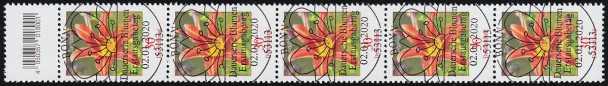 3509 Taglilie 30 Cent, 5er-Streifen mit Codierfeld, ESSt Bonn 2.1.2020