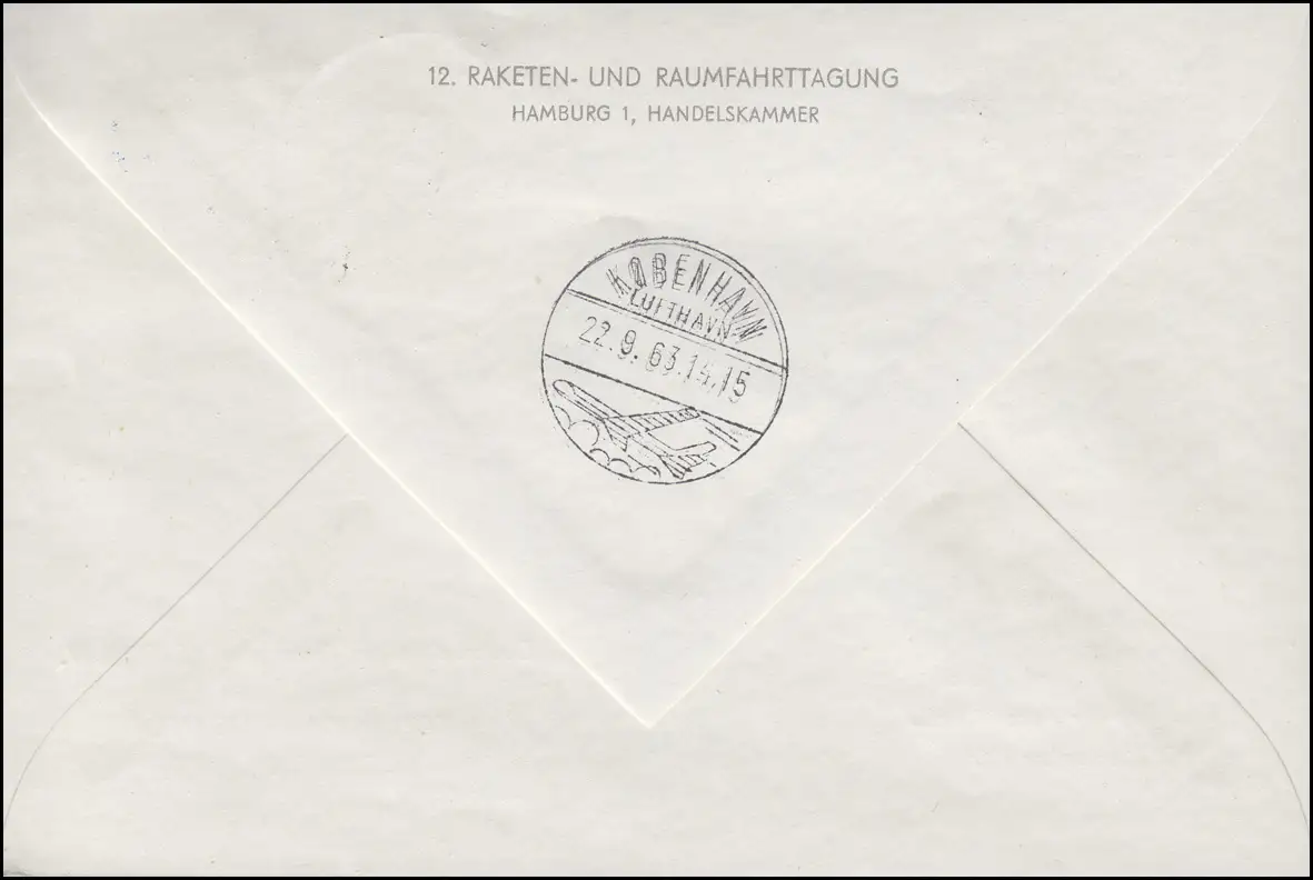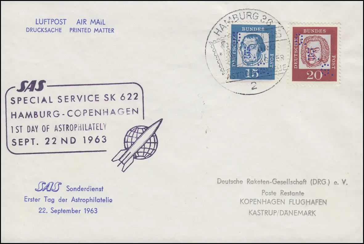Schmuck-Drucksache als Erstflug SAS SPECIAL SERVICE SK 622 HAMBURG - KOPENHAGEN mit passendem Sonderstempel HAMBURG 1. Tag der Astrophiletelie an die Deutsche Raketen-Gesellschaft (DRG) in Kopenhagen mit Ankunftsstempel 22.9.63