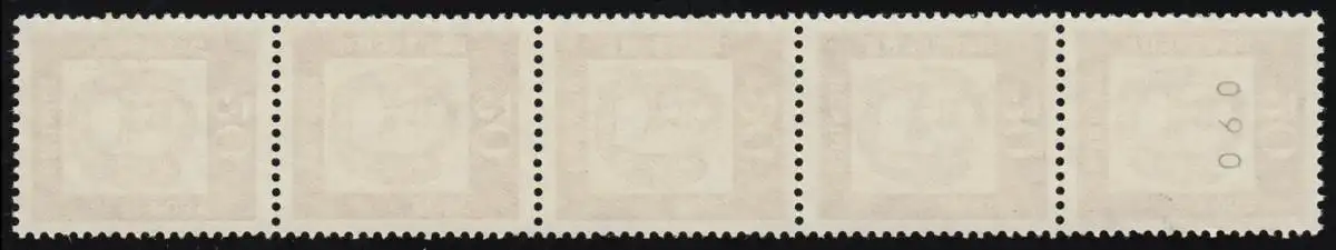 postfrischer 5er-Streifen mit gerader Nummer aus der 500er-Rolle (dreistellig, gerade). Leicht angefaltet zwischen der 3. und 4. Marke.