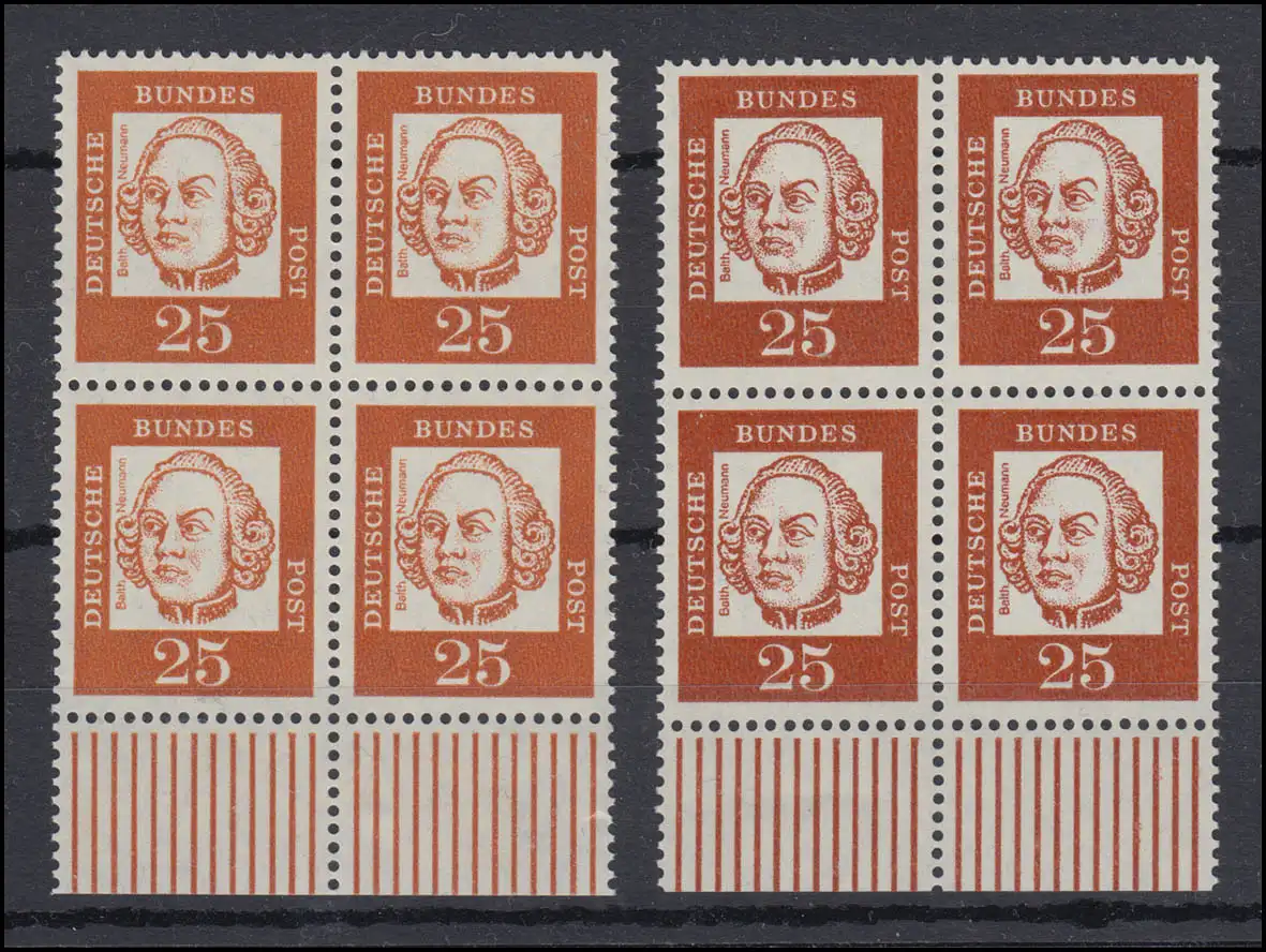 353 Bed. Deutsche 25 Pf. je ein UR-Viererblock in hell- und dunkelorange **