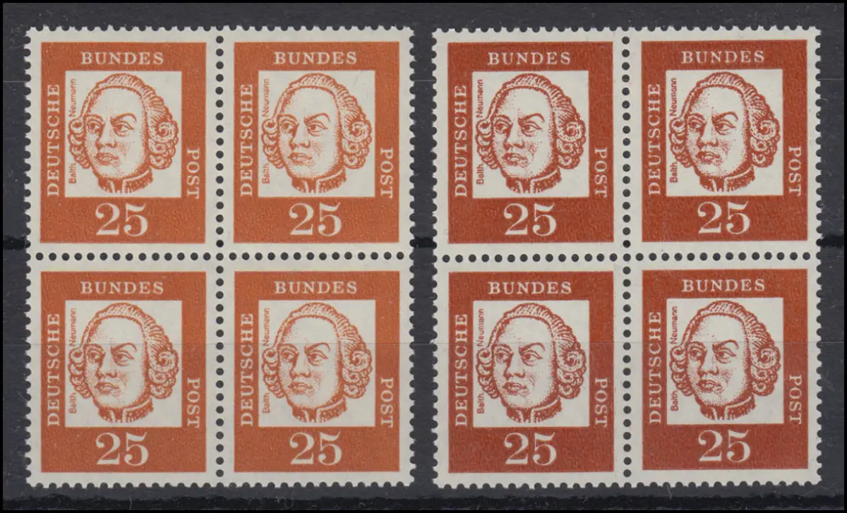 353 Bed. Deutsche 25 Pf. je ein Viererblock in hell- und dunkelorange **