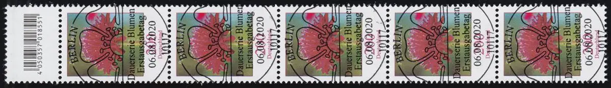 3556 Purpur-Knautie 200 Cent, 5er-Streifen mit Nummer und Codierfeld ESSt BERLIN