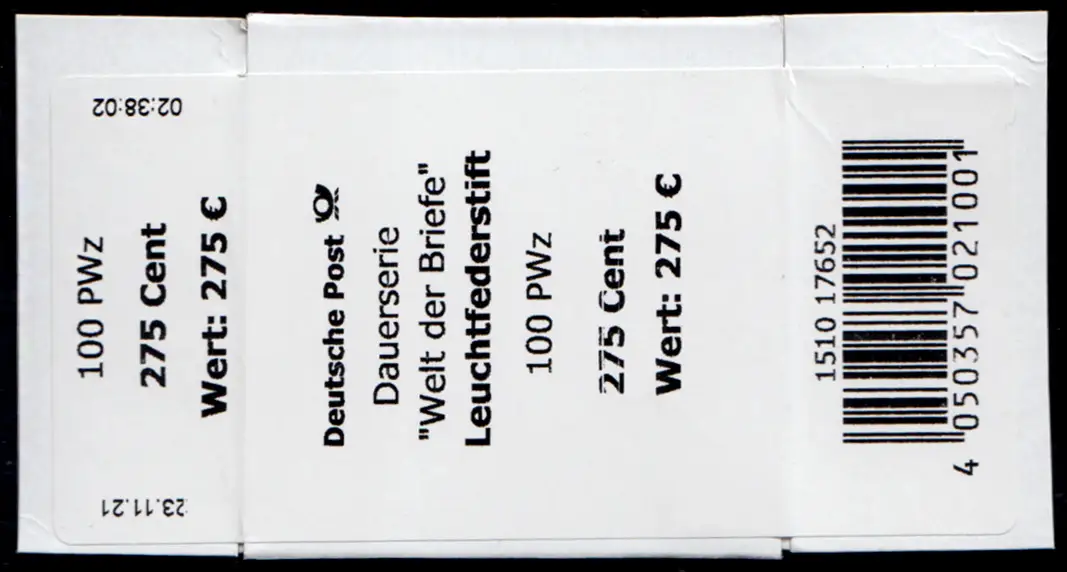 3657 Leuchtfederstift 275 Cent weiß 2021: Banderole/Aufkleber 100er, kleines z