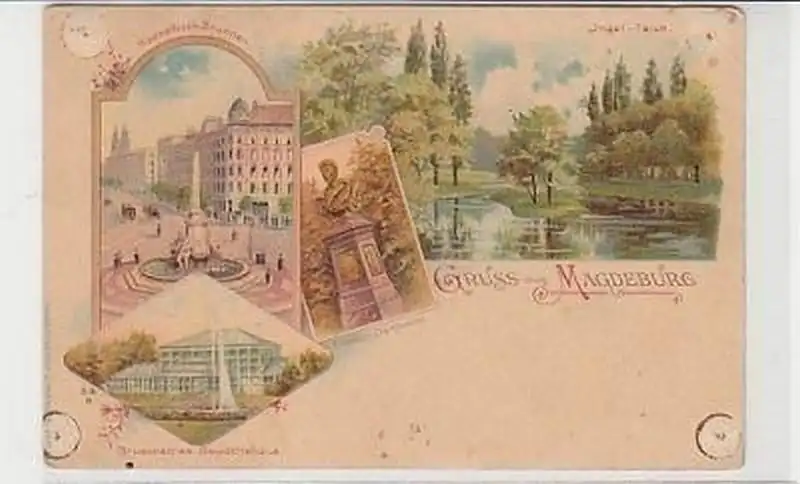 schöne farbige Lithographie, Insel Teich, Hasselbach Brunnen, Friesen Denkmal, Grusonsches Gewächshaus, ungelaufen, gute Erhaltung (2 Ecken etwas bügig, Ecken mit Reiszweckenlöchern) siehe Bild,