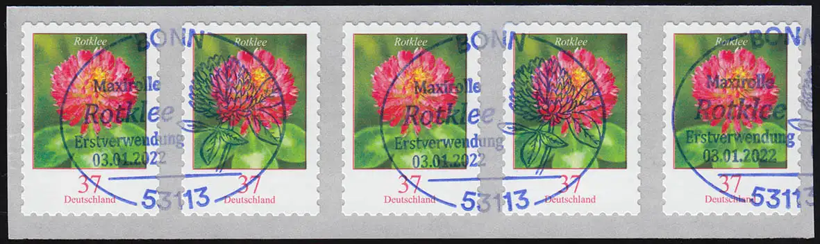 3663 Rotklee 37 Cent sk 5er-Streifen mit UNGERADER Nummer, EV-O Bonn 3.1.22