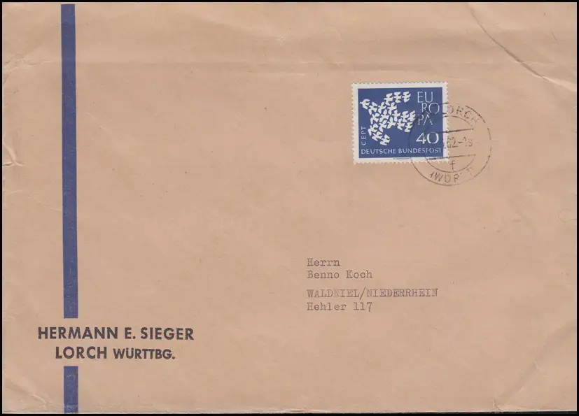 368x Europa / CEPT 40 Pf. EF auf Brief LORCH 13.3.62 nach Waldniel/Niederrhein
