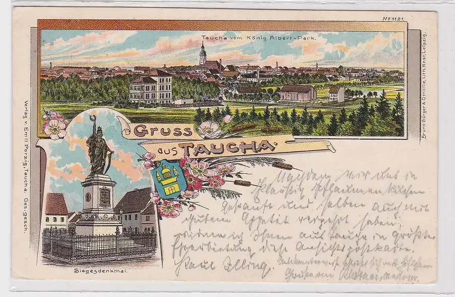 37035 Ak Lithographie Gruß aus Taucha Totalansicht und Siegesdenkmal 1898