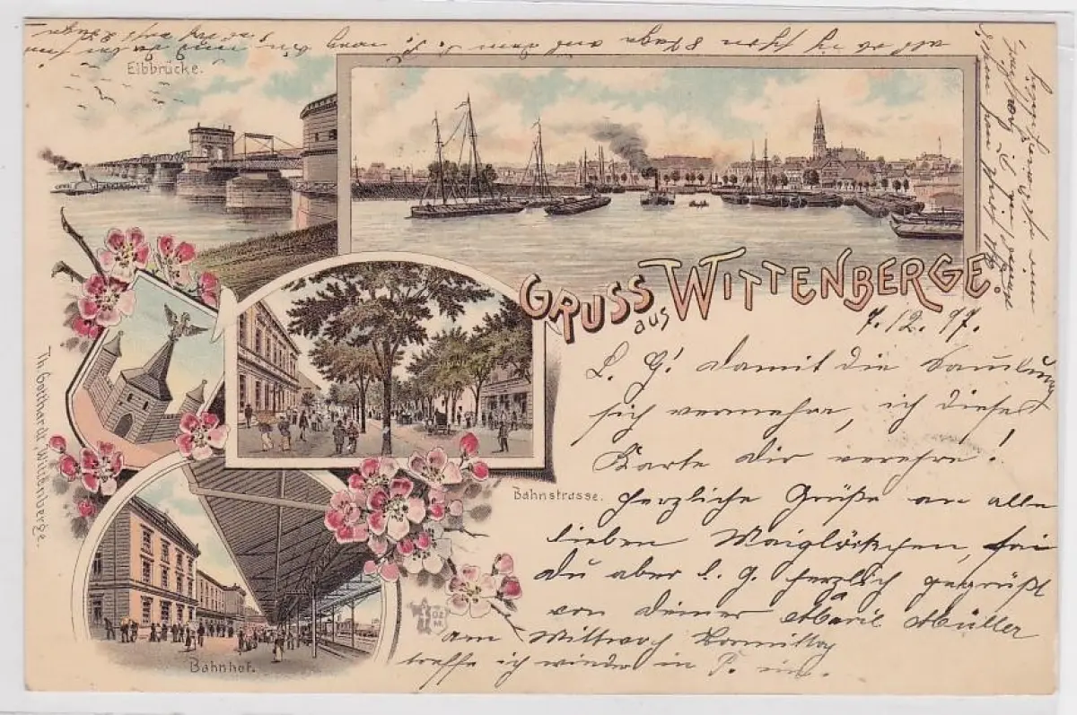 37568 Ak Lithographie Gruß aus Wittenberge Bahnhof, Bahnstraße usw. 1897