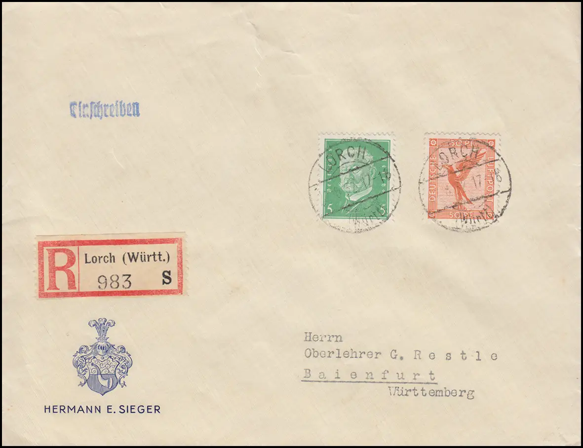 381 Flugpost + 411 Hindenburg MiF auf R-Brief LORCH 27.8.32 nach BAIENFURT 20.8.