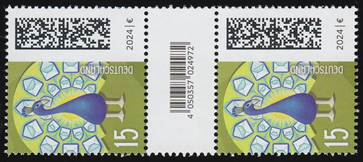 3843 Briefpfau 15 C. aus 200er, Paar mit Nr., KLEINEM CF, ohne Nr **