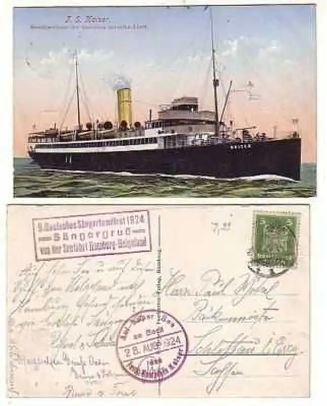 gelaufen mit Stempel auf hoher See an Bord 28.August 1924 des Turb.Dampfers Kaiser und Stempel 9.deutsches Sängerbundfest 1924 Sängergruß von der Seefahrt Hamburg Helgoland, gute Erhaltung (leichte Altersspuren) siehe Bild,
