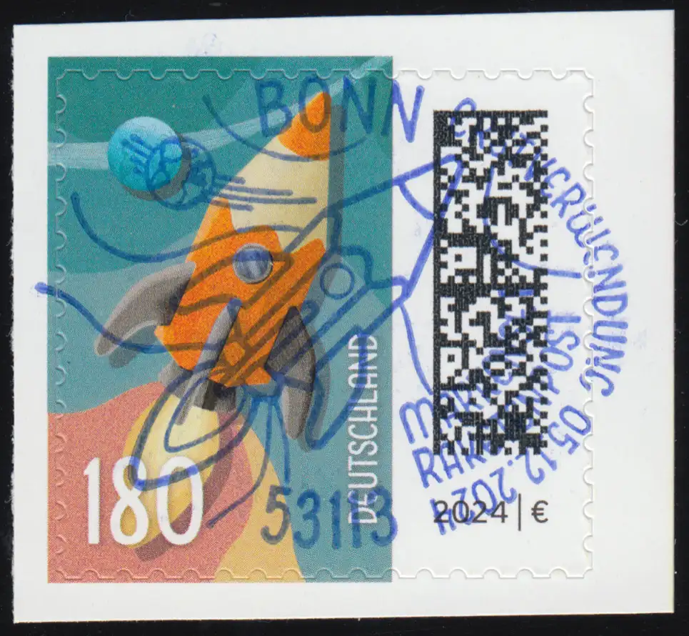 Zusatz-Auflage der Bundesdruckerei BDB (blass graubraune Flügel der Rakete, großes Markenbild) aus Folienblatt 143 III