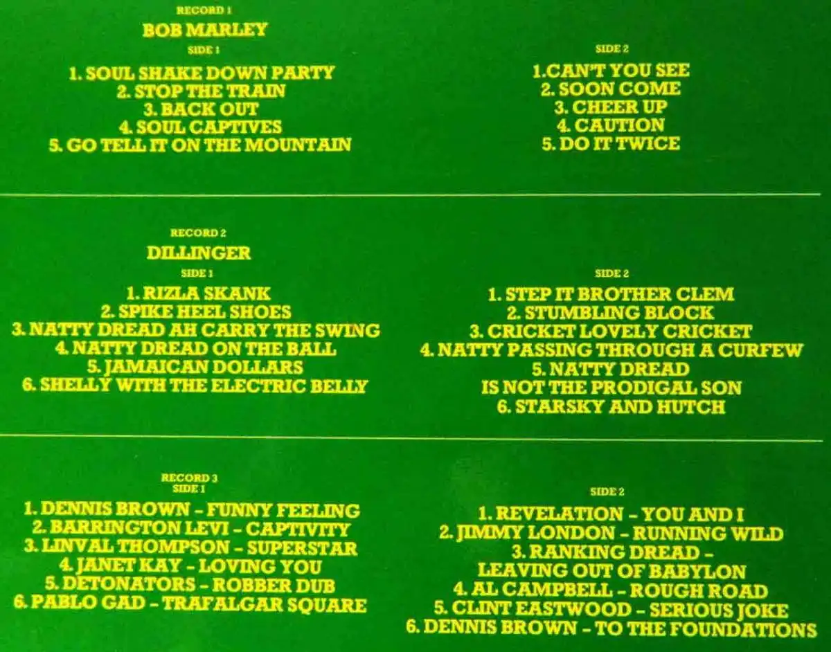 3 Langspielplatten in Box, Reggae Hits, je eine LP mit Bob Marley und  Dillinger, die dritte Lp ist ein Sampler mit Dennis Brown, Clint Eastwood, Pablo Gad, Barrington Levi, Janet Kai, Ranking Dread, Jimmy London, Al Campbell u.a.