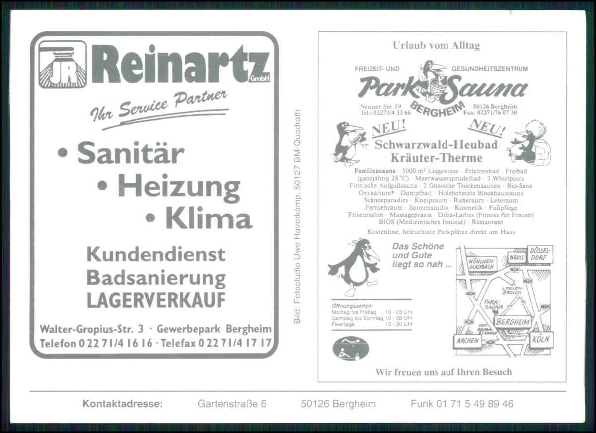 Nicht gelaufen – Werbung von lokalen Sponsoren, u. a. Reinartz GmbH (Sanitär/Heizung) und Freizeit- und Gesundheitszentrum Park-Sauna Bergheim. Rückseite vollständig und dekorativ bedruckt.