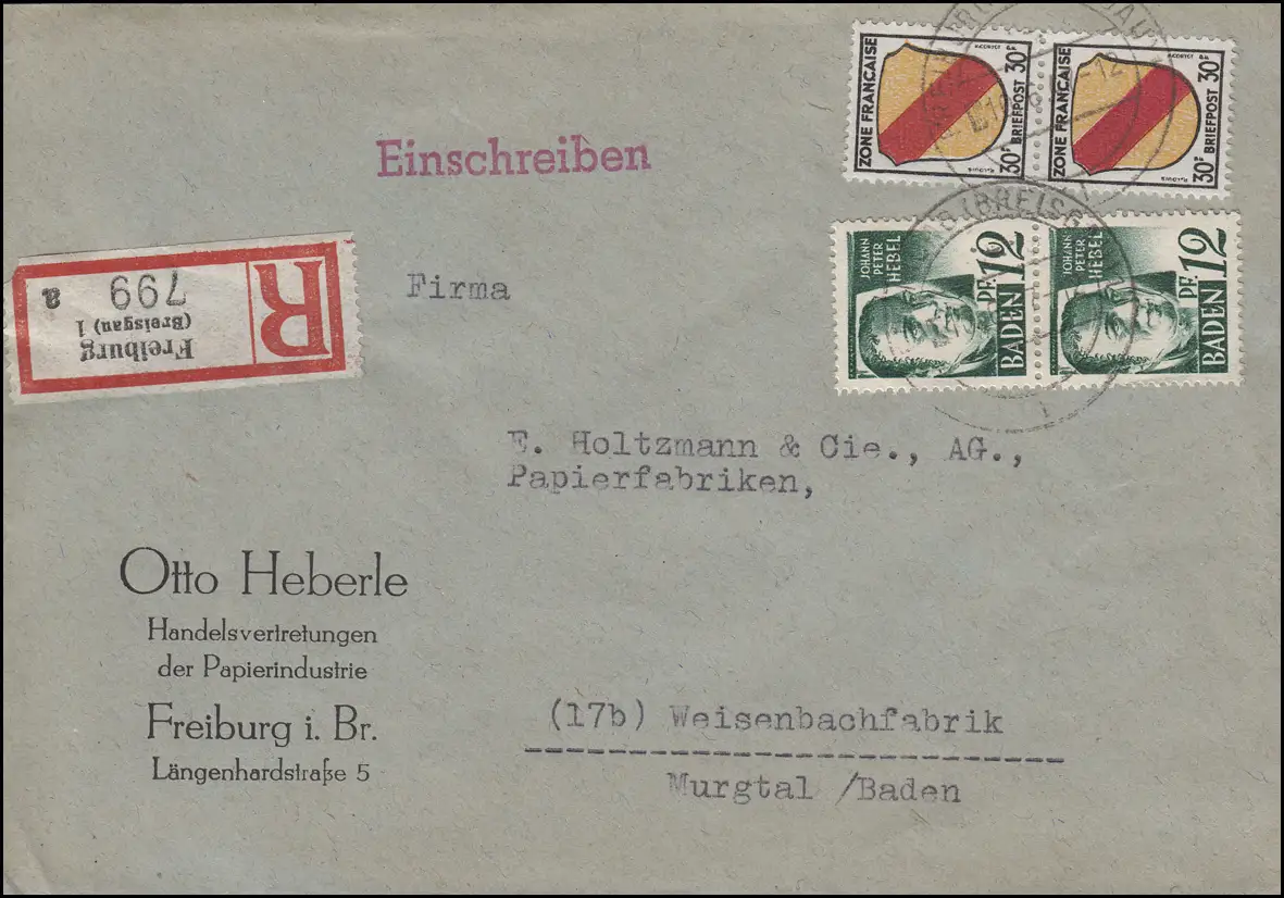 4 Freimarke 12Pf 2mal mit Wappen 30 Pf 2mal auf R-Bf FREIBURG/BREISGAU 10.6.1947