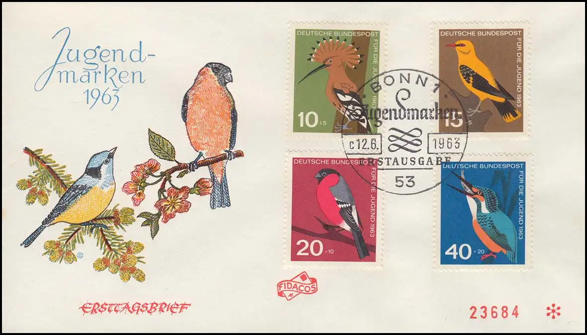 401-404 Einheimische Vögel 1963: Satz komplett auf FIDACOS-FDC ESSt BONN 12.6.63