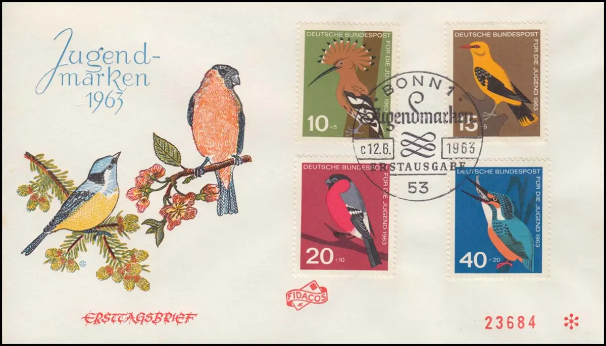 401-404 Einheimische Vögel 1963: Satz komplett auf FIDACOS-FDC ESSt BONN 12.6.63