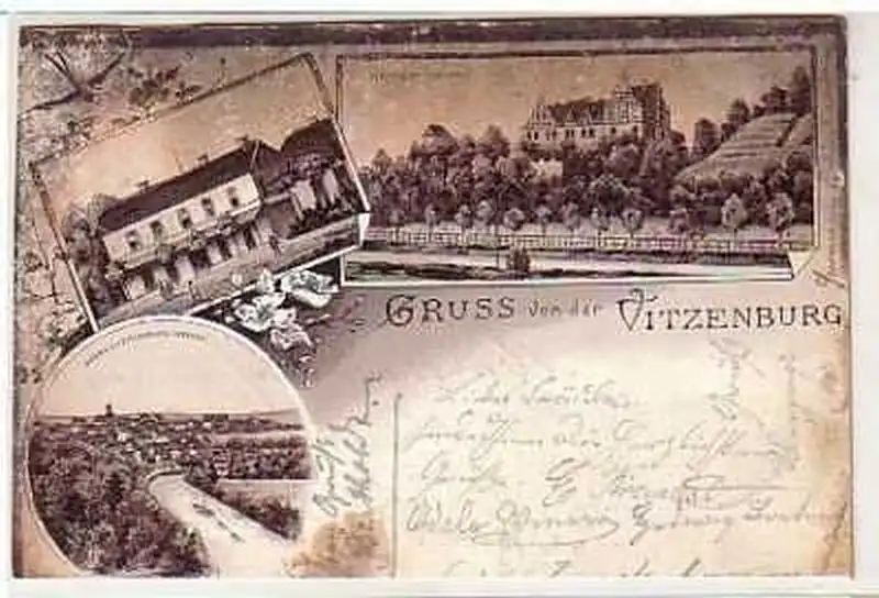 schöne Lithographie, Schloß Vitzenburg, Restaurant, Nebra von Vitzenburg gesehen, gelaufen, gebrauchte Erhaltung (Altersspuren, fleckig, kleiner Eckbug) siehe Bild,