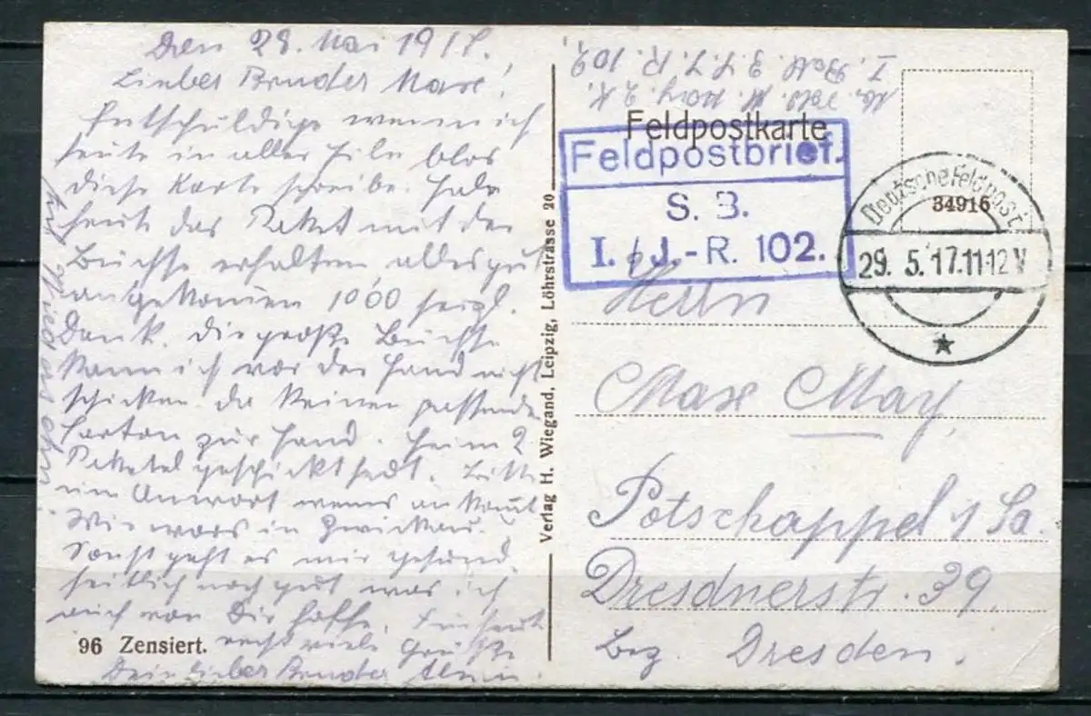(4042) Rethel - Feldzug 1914/17 - gel. 29.5.1917 - Stempel: Deutsche Feldpost und Feldpostbrief S. B. I. J.-R. 102.