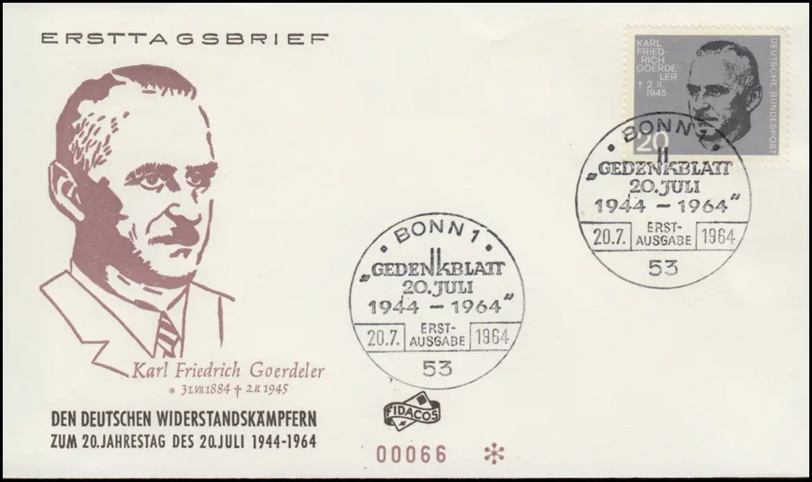 Einzelmarke aus Block 3 mit Ersttagssonderstempel Bonn 20.7.1964 auf FDC: Den Deutschen Widerstandskämpfern zum 20. Jahrestag des 20. Juli 1944-1964