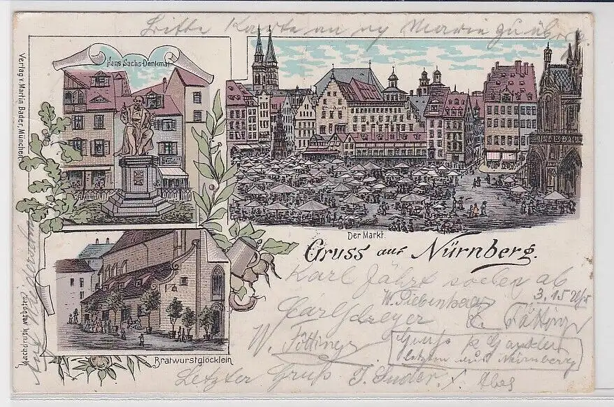 44093 Ak Lithographie Gruß aus Nürnberg Markt, Bratwurstglöcklein usw. 1897