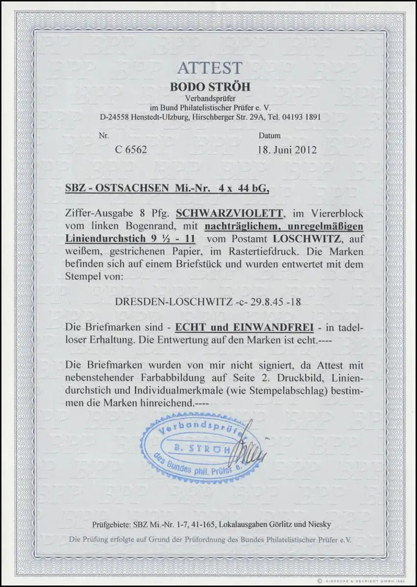 44Gb Ziffer 8 Pf. Loschwitz, seltene Farbe, Viererblock gestempelt, FA Ströh BPP