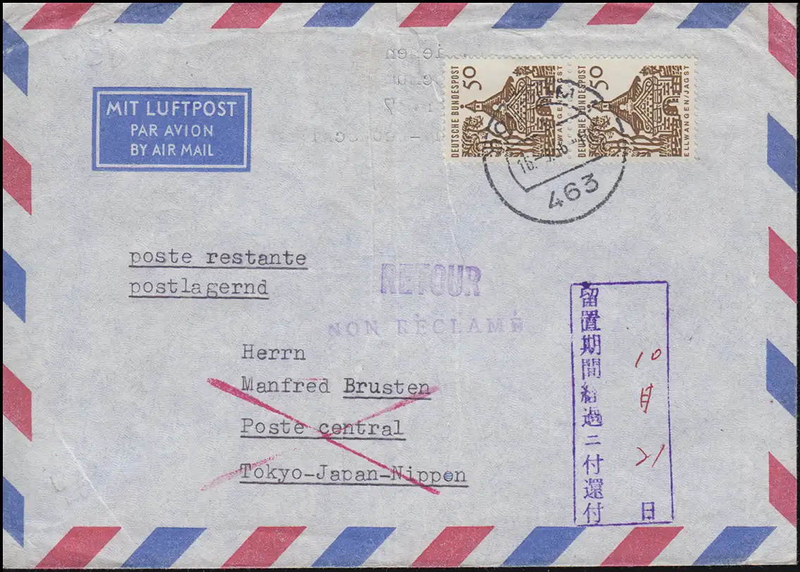 Portogerechte Mehrfachfrankatur auf Auslandsbrief nach Japan und zurück: mit japanischen Retour-Stempel. Umschlag mittig gefaltet.