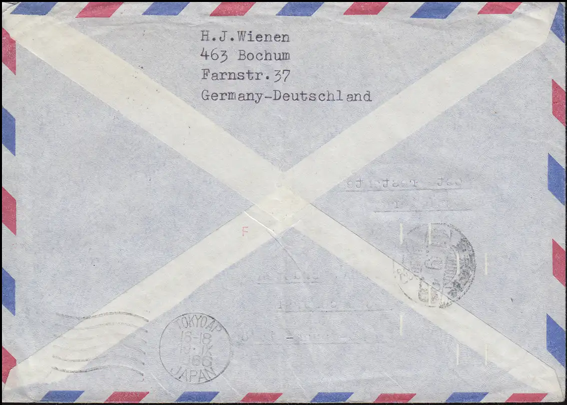 458 Bauwerke als senkrechtes Paar MeF Lp.-Brief BOCHUM 16.9.66 nach TOKIO 19.9.
