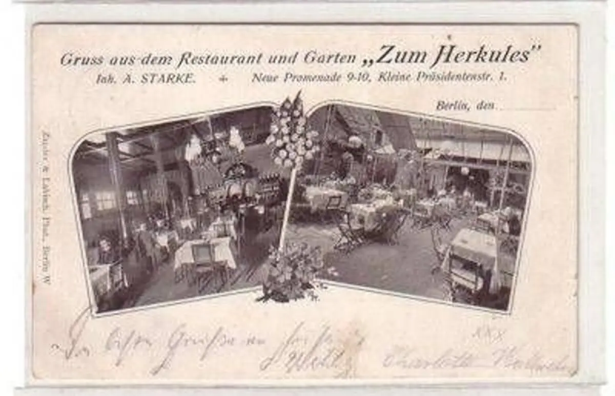 Gruss aus dem Restaurant und Garten "Zum Herkules" Inh. A. Starke, Neue Promenade 9-10, Kleine Präsidentenstr. 1 gelaufen gute Erhaltung, normale Altersspuren, siehe Bild
