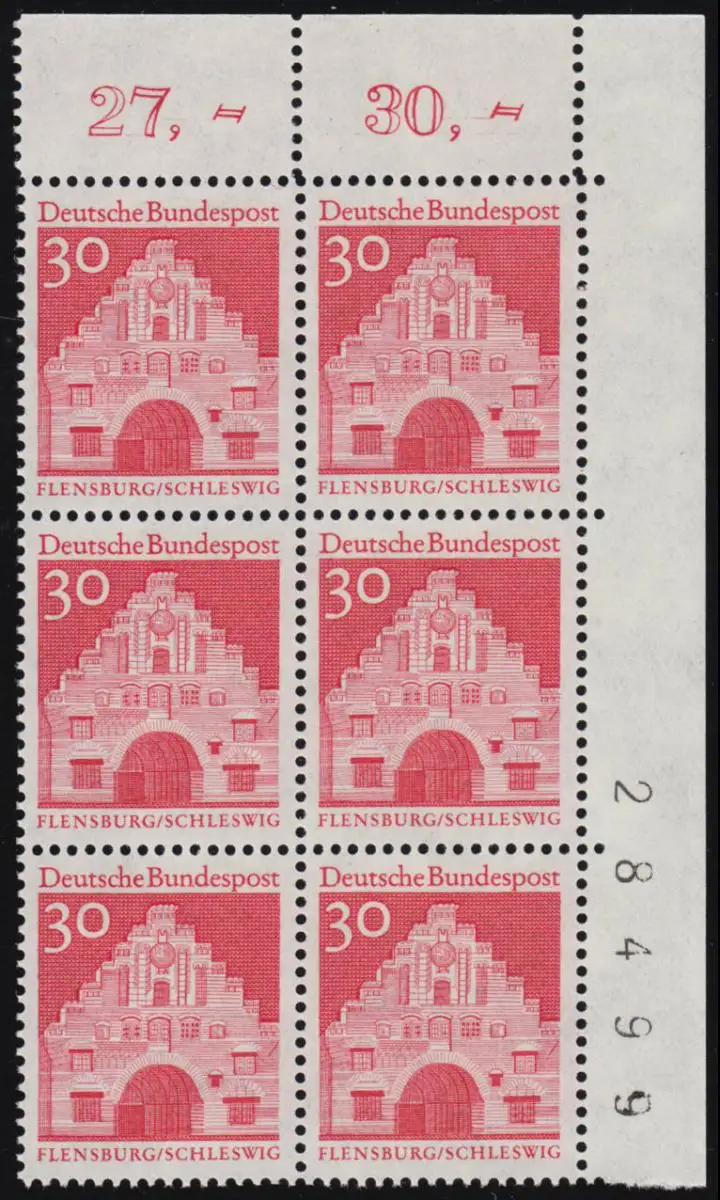 493 Bauwerke groß 30 Pf. ER-6er-Block oben rechts mit RZ und spitzen AZ oben, **