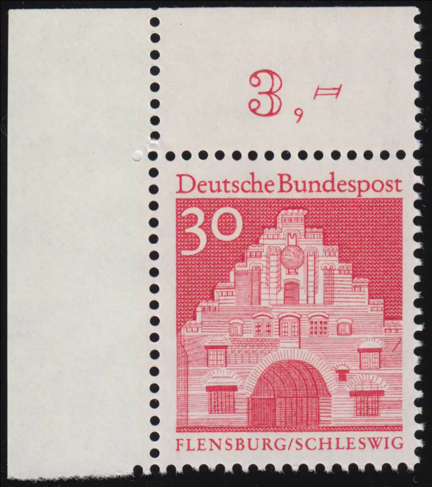 493 Bauwerke groß 30 Pf. als Ecke oben links: Stanzrest im Zähnungsloch, **