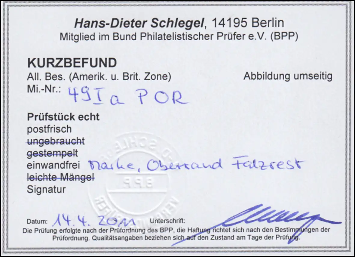 postfrisch, geprüft Schlegel BPP + Befund, MICHEL 2024: 250,- Euro. Allerdings ist der Oberrand leicht angefaltet und ein Falzrest befindet sich vorne auf dem Oberrand (siehe Befund). Die Marke selbst ist einwandfrei.