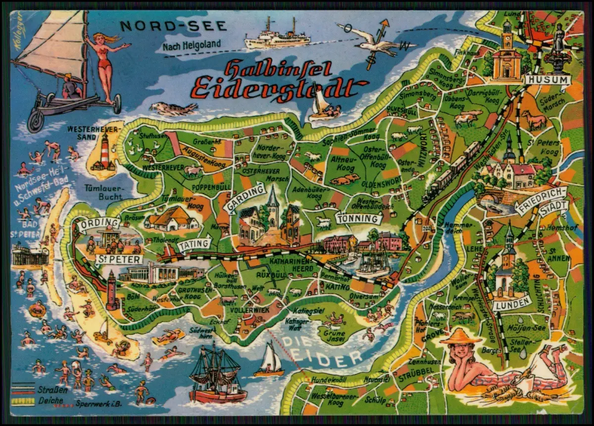AK - Nordsee Husum Landkarte Halbinsel Eiderstedt und Kutsche im