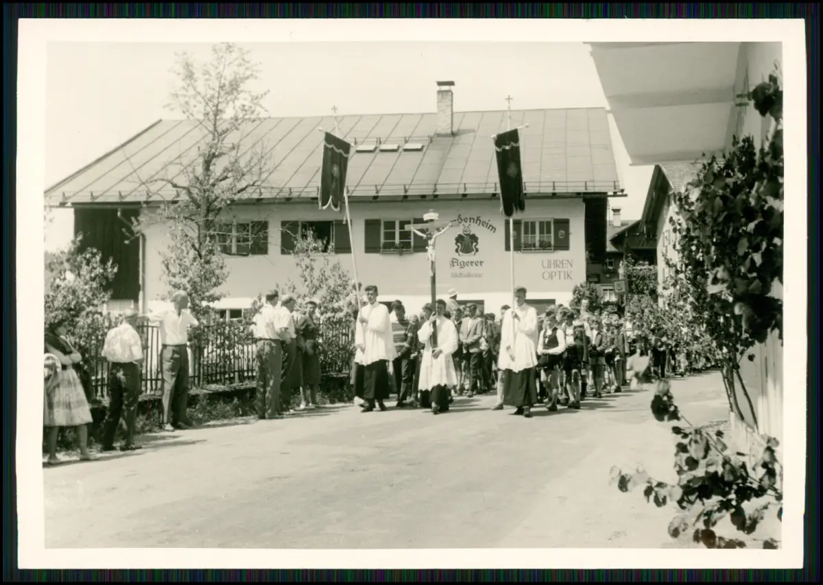 4x Foto 13x9cm - Prozession Dorf Bayern - Gebäude Aufschrift Fremdenheim Angerer