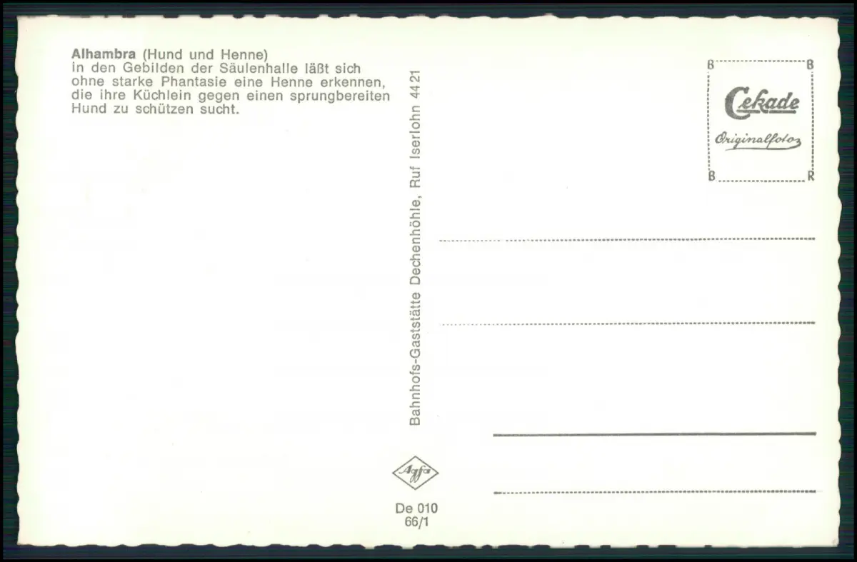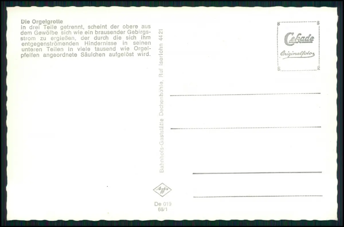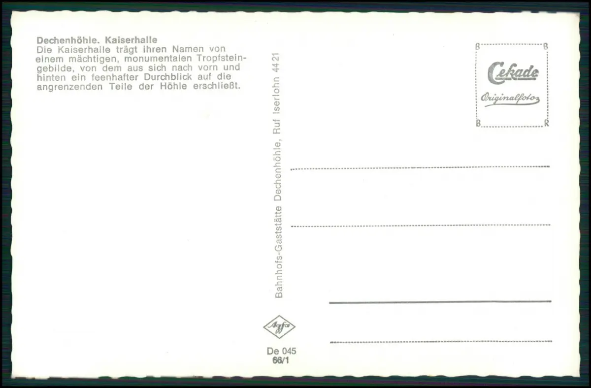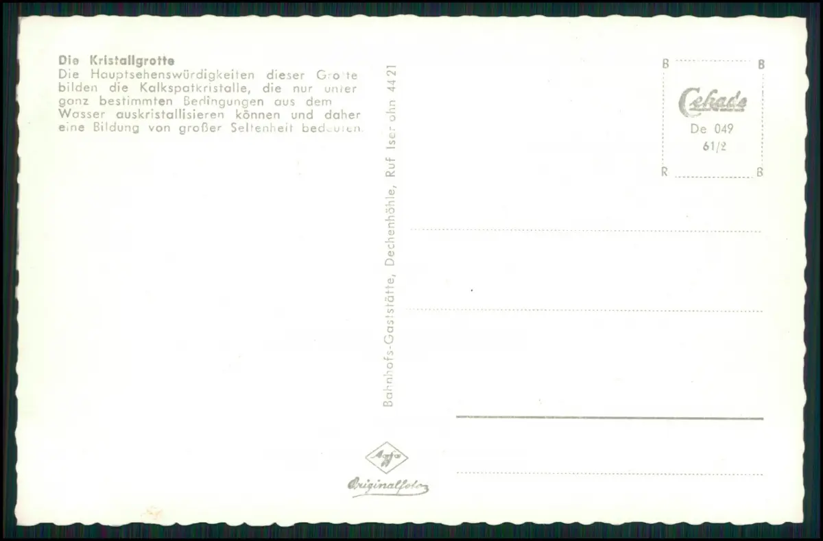 Iserlohn – Dechenhöhle, eindrucksvolle Kristallgrotte mit prächtigen Tropfsteinen, aufgenommen von der bekannten Cekade (Cramers Kunstanstalt Dortmund), einem traditionsreichen deutschen Postkartenverlag.