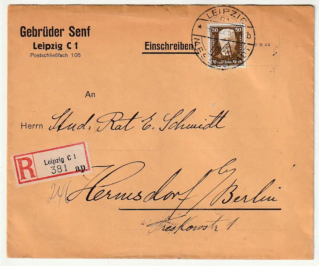 50 Pfg. Hindenburg (Michel Nr. 406) als EF auf R-Brief