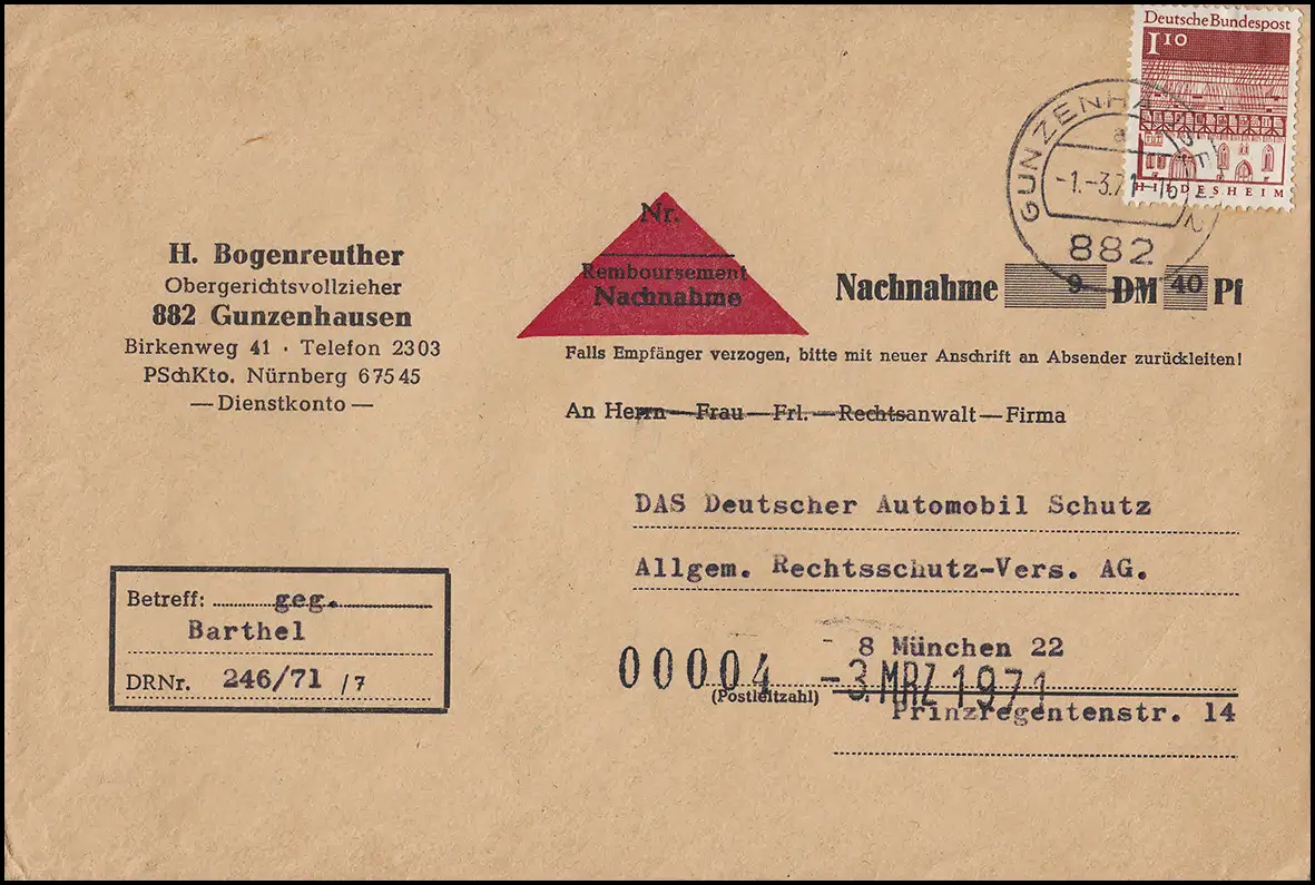 portogerechte Einzelfrankatur per Nachnahme eines Obergerichtsvollziehers auf Fernbrief an DAS - Deutscher Automobil Schutz / Allgemeine Rechtsschutz-Versicherung in München