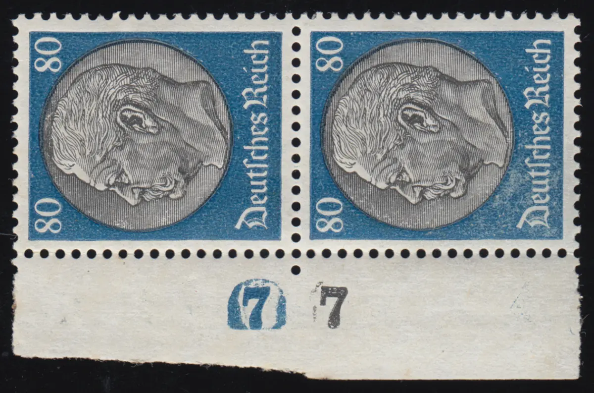 527 Hindenburg 80 Pf., Randpaar DZ 7, Gummi leicht fleckig / unfrisch *