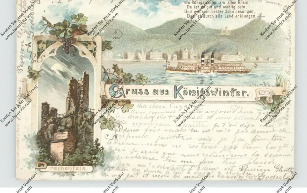 5330 KÖNIGSWINTER, Lithographie 1899, Drachenfels, Rheindampfer vor Königswinter, kl. Knick