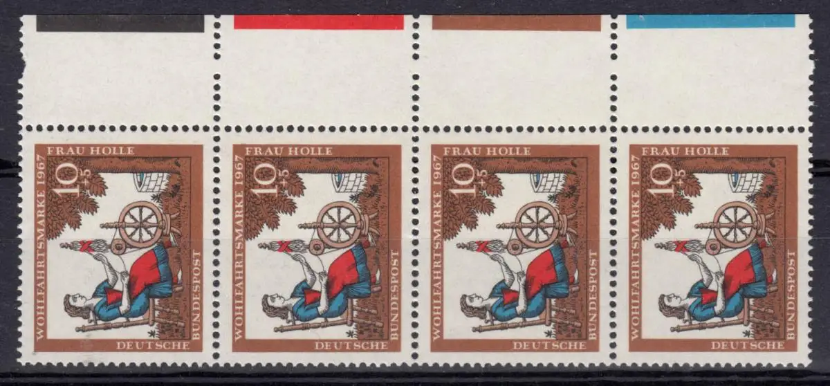 538 Frau Holle: Farbrand-Viererstreifen mit seltener Wofa-Zähnung W6 + PLF, **