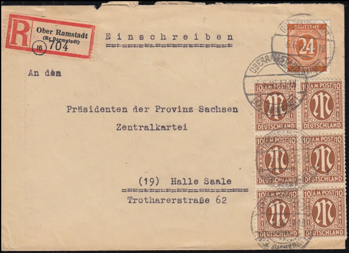 6 AM-Post 10 Pf. mit 925 Kontrollrat MiF R-Brief OBERRAMSTADT / DARMSTADT 6.6.46