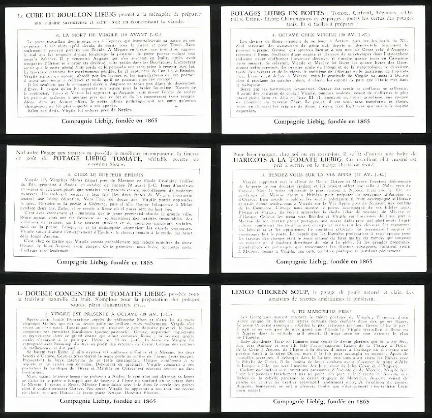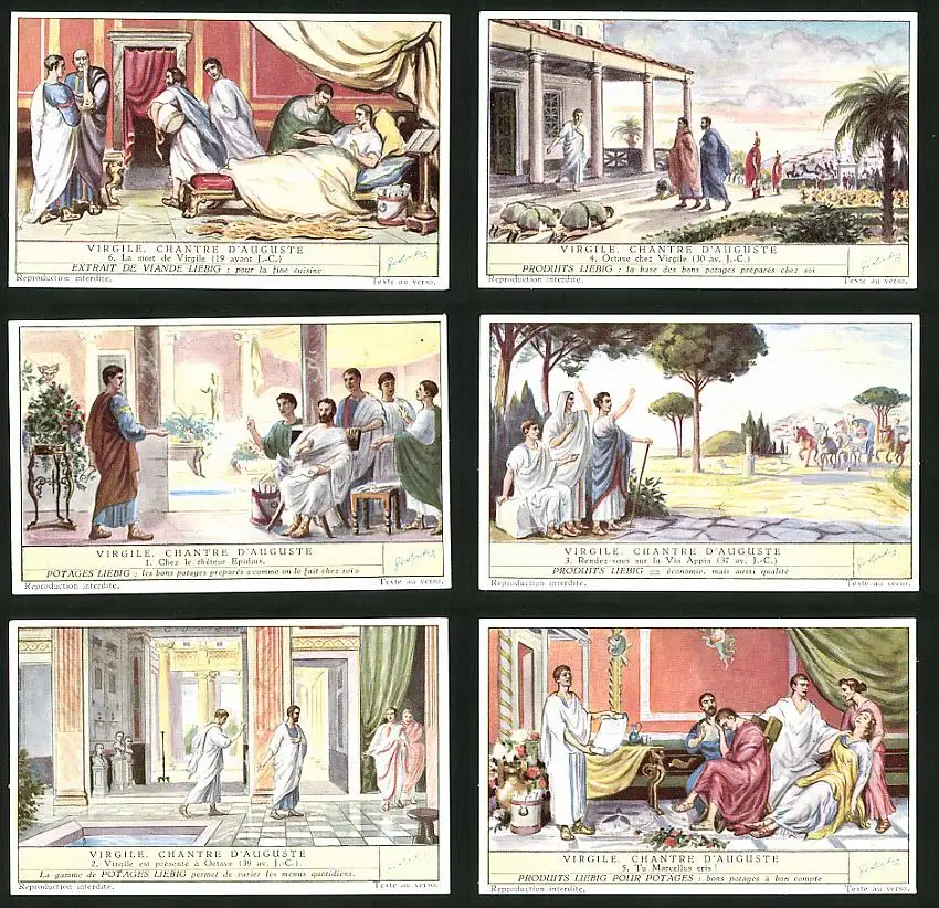 6 Sammelbilder Liebig, Serie Nr. 1581: Birgile, Chantre d`Auguste, Chez le rhéteur Epidius, Tu Marcellus eris